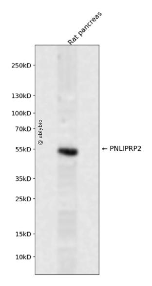 Western blot analysis of PNLIPRP2 expressed in Rat pancreas using PNLIPRP2 Rabbit pAb at 1:1000. Secondary antibody: HRP Goat Anti-Rabbit IgG (H+L) at 1:5000. Lysates/proteins: 30ug per lane. Blocking buffer: 5% non-fat dry milk in TBST. Detection: ECL Enhanced Kit. Exposure time: 120s.