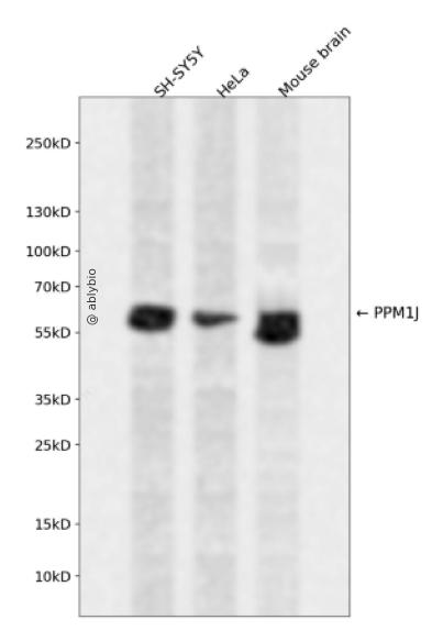 Western blot analysis of PPM1J expressed in SH-SY5Y,HeLa,Mouse brain using PPM1J Rabbit pAb at 1:1000. Secondary antibody: HRP Goat Anti-Rabbit IgG (H+L) at 1:5000. Lysates/proteins: 30ug per lane. Blocking buffer: 5% non-fat dry milk in TBST. Detection: ECL Enhanced Kit. Exposure time: 120s.