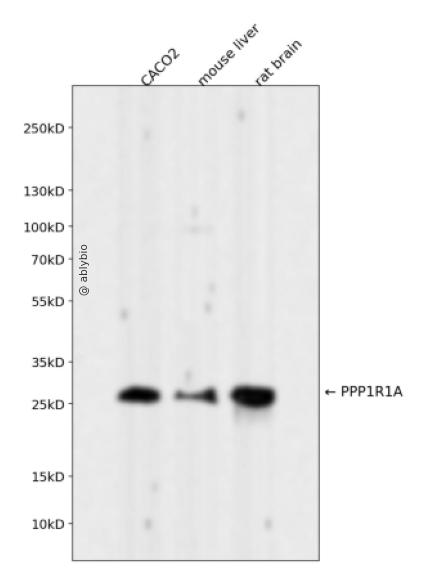 Western blot analysis of PPP1R1A expressed in CACO2,mouse liver,rat brain using PPP1R1A Rabbit mAb at 1:1000. Secondary antibody: HRP Goat Anti-Rabbit IgG (H+L) at 1:5000. Lysates/proteins: 30ug per lane. Blocking buffer: 5% non-fat dry milk in TBST. Detection: ECL Enhanced Kit. Exposure time: 120s.