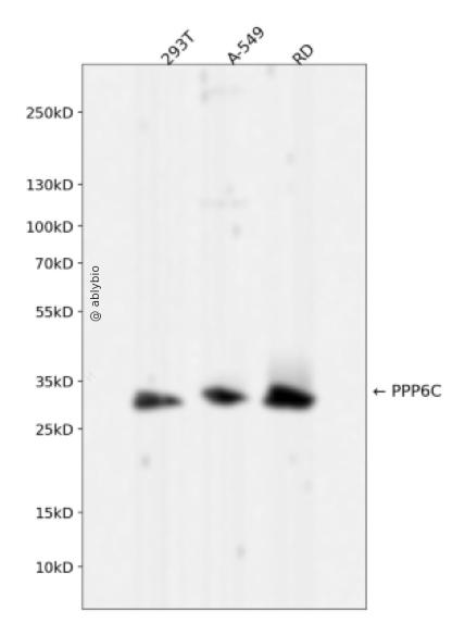 Western blot analysis of PPP6C expressed in 293T,A-549,RD using PPP6C Rabbit mAb at 1:1000. Secondary antibody: HRP Goat Anti-Rabbit IgG (H+L) at 1:5000. Lysates/proteins: 30ug per lane. Blocking buffer: 5% non-fat dry milk in TBST. Detection: ECL Enhanced Kit. Exposure time: 120s.