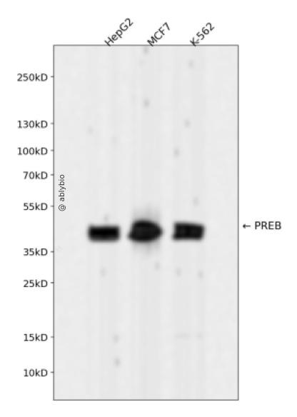 Western blot analysis of PREB expressed in HepG2,MCF7,K-562 using PREB Rabbit mAb at 1:1000. Secondary antibody: HRP Goat Anti-Rabbit IgG (H+L) at 1:5000. Lysates/proteins: 30ug per lane. Blocking buffer: 5% non-fat dry milk in TBST. Detection: ECL Enhanced Kit. Exposure time: 120s.