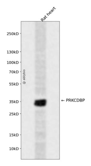 Western blot analysis of PRKCDBP expressed in Rat heart using PRKCDBP Rabbit pAb at 1:1000. Secondary antibody: HRP Goat Anti-Rabbit IgG (H+L) at 1:5000. Lysates/proteins: 30ug per lane. Blocking buffer: 5% non-fat dry milk in TBST. Detection: ECL Enhanced Kit. Exposure time: 120s.