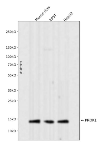 Western blot analysis of PROK1 expressed in Mouse liver,293T,HepG2 using PROK1 Rabbit mAb at 1:1000. Secondary antibody: HRP Goat Anti-Rabbit IgG (H+L) at 1:5000. Lysates/proteins: 30ug per lane. Blocking buffer: 5% non-fat dry milk in TBST. Detection: ECL Enhanced Kit. Exposure time: 120s.