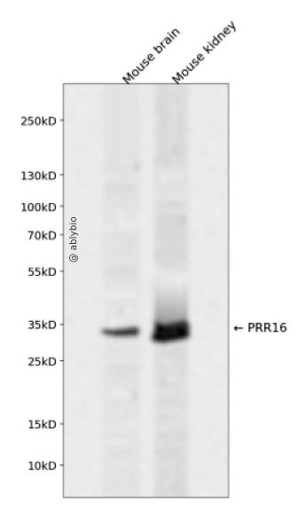 Western blot analysis of PRR16 expressed in Mouse brain,Mouse kidney using PRR16 Rabbit pAb at 1:1000. Secondary antibody: HRP Goat Anti-Rabbit IgG (H+L) at 1:5000. Lysates/proteins: 30ug per lane. Blocking buffer: 5% non-fat dry milk in TBST. Detection: ECL Enhanced Kit. Exposure time: 120s.
