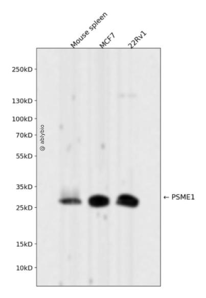 Western blot analysis of PSME1 expressed in Mouse spleen,MCF7,22Rv1 using PSME1 Rabbit mAb at 1:1000. Secondary antibody: HRP Goat Anti-Rabbit IgG (H+L) at 1:5000. Lysates/proteins: 30ug per lane. Blocking buffer: 5% non-fat dry milk in TBST. Detection: ECL Enhanced Kit. Exposure time: 120s.