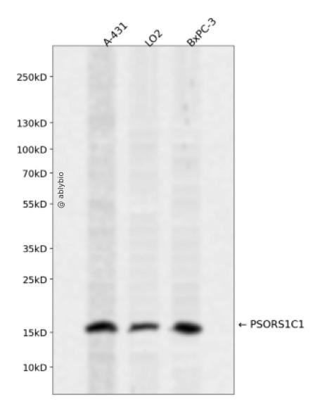 Western blot analysis of PSORS1C1 expressed in A-431,LO2,BxPC-3 using PSORS1C1 Rabbit pAb at 1:1000. Secondary antibody: HRP Goat Anti-Rabbit IgG (H+L) at 1:5000. Lysates/proteins: 30ug per lane. Blocking buffer: 5% non-fat dry milk in TBST. Detection: ECL Enhanced Kit. Exposure time: 120s.