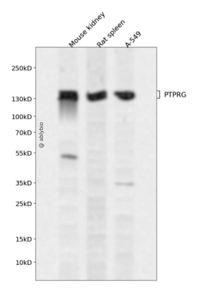 Western blot analysis of PTPRG expressed in Mouse kidney,Rat spleen,A-549 using PTPRG Rabbit pAb at 1:1000. Secondary antibody: HRP Goat Anti-Rabbit IgG (H+L) at 1:5000. Lysates/proteins: 30ug per lane. Blocking buffer: 5% non-fat dry milk in TBST. Detection: ECL Enhanced Kit. Exposure time: 120s.