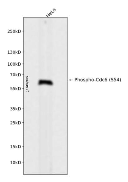 Western blot analysis of Phospho-Cdc6 (S54) expressed in HeLa using Phospho-Cdc6 (S54) Rabbit mAb at 1:1000. Secondary antibody: HRP Goat Anti-Rabbit IgG (H+L) at 1:5000. Lysates/proteins: 30ug per lane. Blocking buffer: 5% non-fat dry milk in TBST. Detection: ECL Enhanced Kit. Exposure time: 120s.