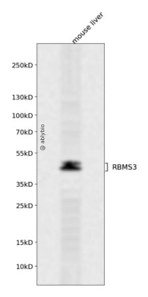 Western blot analysis of RBMS3 expressed in mouse liver using RBMS3 Rabbit pAb at 1:1000. Secondary antibody: HRP Goat Anti-Rabbit IgG (H+L) at 1:5000. Lysates/proteins: 30ug per lane. Blocking buffer: 5% non-fat dry milk in TBST. Detection: ECL Enhanced Kit. Exposure time: 120s.