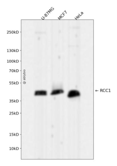 Western blot analysis of RCC1 expressed in U-87MG,MCF7,HeLa using RCC1 Rabbit mAb at 1:1000. Secondary antibody: HRP Goat Anti-Rabbit IgG (H+L) at 1:5000. Lysates/proteins: 30ug per lane. Blocking buffer: 5% non-fat dry milk in TBST. Detection: ECL Enhanced Kit. Exposure time: 120s.