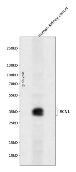 Western blot analysis of RCN1 expressed in human kidney cancer using RCN1 Rabbit pAb at 1:1000. Secondary antibody: HRP Goat Anti-Rabbit IgG (H+L) at 1:5000. Lysates/proteins: 30ug per lane. Blocking buffer: 5% non-fat dry milk in TBST. Detection: ECL Enhanced Kit. Exposure time: 120s.