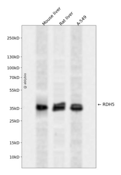 Western blot analysis of RDH5 expressed in Mouse liver,Rat liver,A-549 using RDH5 Rabbit pAb at 1:1000. Secondary antibody: HRP Goat Anti-Rabbit IgG (H+L) at 1:5000. Lysates/proteins: 30ug per lane. Blocking buffer: 5% non-fat dry milk in TBST. Detection: ECL Enhanced Kit. Exposure time: 120s.