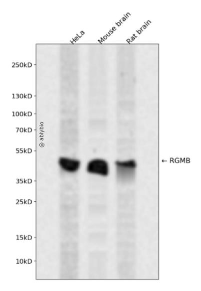Western blot analysis of RGMB expressed in HeLa,Mouse brain,Rat brain using RGMB Rabbit pAb at 1:1000. Secondary antibody: HRP Goat Anti-Rabbit IgG (H+L) at 1:5000. Lysates/proteins: 30ug per lane. Blocking buffer: 5% non-fat dry milk in TBST. Detection: ECL Enhanced Kit. Exposure time: 120s.