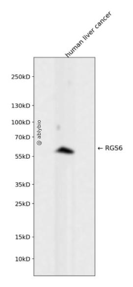 Western blot analysis of RGS6 expressed in human liver cancer using RGS6 Rabbit mAb at 1:1000. Secondary antibody: HRP Goat Anti-Rabbit IgG (H+L) at 1:5000. Lysates/proteins: 30ug per lane. Blocking buffer: 5% non-fat dry milk in TBST. Detection: ECL Enhanced Kit. Exposure time: 120s.