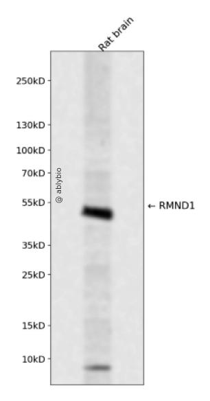 Western blot analysis of RMND1 expressed in Rat brain using RMND1 Rabbit pAb at 1:1000. Secondary antibody: HRP Goat Anti-Rabbit IgG (H+L) at 1:5000. Lysates/proteins: 30ug per lane. Blocking buffer: 5% non-fat dry milk in TBST. Detection: ECL Enhanced Kit. Exposure time: 120s.