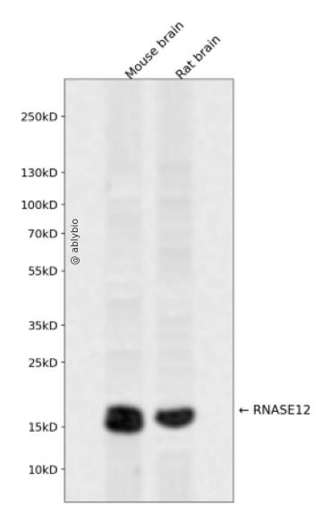 Western blot analysis of RNASE12 expressed in Mouse brain,Rat brain using RNASE12 Rabbit pAb at 1:1000. Secondary antibody: HRP Goat Anti-Rabbit IgG (H+L) at 1:5000. Lysates/proteins: 30ug per lane. Blocking buffer: 5% non-fat dry milk in TBST. Detection: ECL Enhanced Kit. Exposure time: 120s.