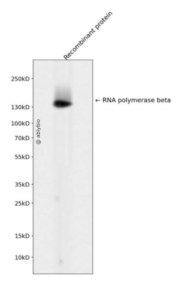 Western blot analysis of RNA polymerase beta expressed in Recombinant protein using RNA polymerase beta Rabbit mAb at 1:1000. Secondary antibody: HRP Goat Anti-Rabbit IgG (H+L) at 1:5000. Lysates/proteins: 30ug per lane. Blocking buffer: 5% non-fat dry milk in TBST. Detection: ECL Enhanced Kit. Exposure time: 120s.