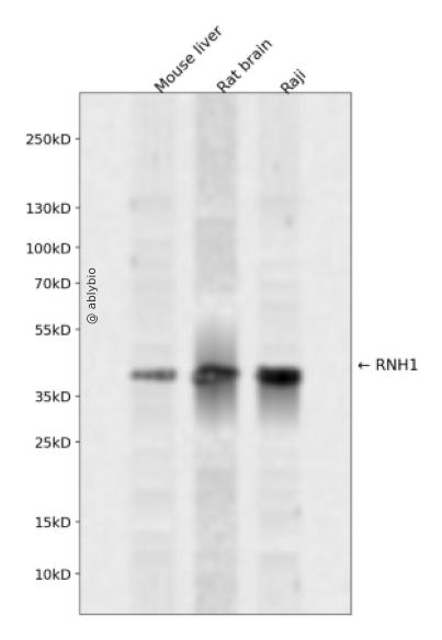 Western blot analysis of RNH1 expressed in Mouse liver,Rat brain,Raji using RNH1 Rabbit pAb at 1:1000. Secondary antibody: HRP Goat Anti-Rabbit IgG (H+L) at 1:5000. Lysates/proteins: 30ug per lane. Blocking buffer: 5% non-fat dry milk in TBST. Detection: ECL Enhanced Kit. Exposure time: 120s.