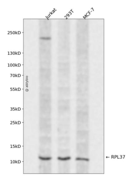 Western blot analysis of RPL37 expressed in Jurkat,293T,MCF-7 using RPL37 Rabbit pAb at 1:1000. Secondary antibody: HRP Goat Anti-Rabbit IgG (H+L) at 1:5000. Lysates/proteins: 30ug per lane. Blocking buffer: 5% non-fat dry milk in TBST. Detection: ECL Enhanced Kit. Exposure time: 120s.