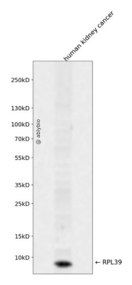 Western blot analysis of RPL39 expressed in human kidney cancer using RPL39 Rabbit pAb at 1:1000. Secondary antibody: HRP Goat Anti-Rabbit IgG (H+L) at 1:5000. Lysates/proteins: 30ug per lane. Blocking buffer: 5% non-fat dry milk in TBST. Detection: ECL Enhanced Kit. Exposure time: 120s.