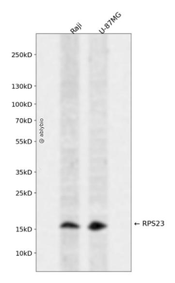 Western blot analysis of RPS23 expressed in Raji,U-87MG using RPS23 Rabbit pAb at 1:1000. Secondary antibody: HRP Goat Anti-Rabbit IgG (H+L) at 1:5000. Lysates/proteins: 30ug per lane. Blocking buffer: 5% non-fat dry milk in TBST. Detection: ECL Enhanced Kit. Exposure time: 120s.