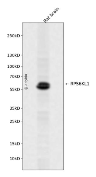 Western blot analysis of RPS6KL1 expressed in Rat brain using RPS6KL1 Rabbit pAb at 1:1000. Secondary antibody: HRP Goat Anti-Rabbit IgG (H+L) at 1:5000. Lysates/proteins: 30ug per lane. Blocking buffer: 5% non-fat dry milk in TBST. Detection: ECL Enhanced Kit. Exposure time: 120s.