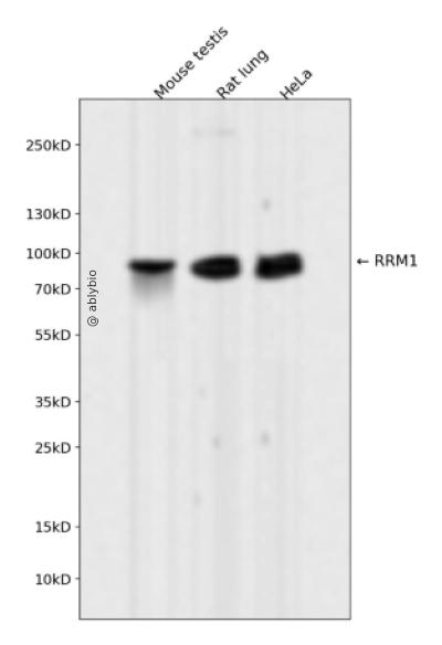 Western blot analysis of RRM1 expressed in Mouse testis,Rat lung,HeLa using RRM1 Rabbit mAb at 1:1000. Secondary antibody: HRP Goat Anti-Rabbit IgG (H+L) at 1:5000. Lysates/proteins: 30ug per lane. Blocking buffer: 5% non-fat dry milk in TBST. Detection: ECL Enhanced Kit. Exposure time: 120s.