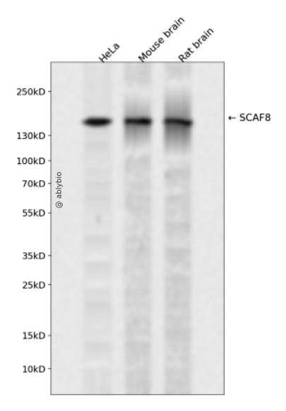 Western blot analysis of SCAF8 expressed in HeLa,Mouse brain,Rat brain using SCAF8 Rabbit pAb at 1:1000. Secondary antibody: HRP Goat Anti-Rabbit IgG (H+L) at 1:5000. Lysates/proteins: 30ug per lane. Blocking buffer: 5% non-fat dry milk in TBST. Detection: ECL Enhanced Kit. Exposure time: 120s.