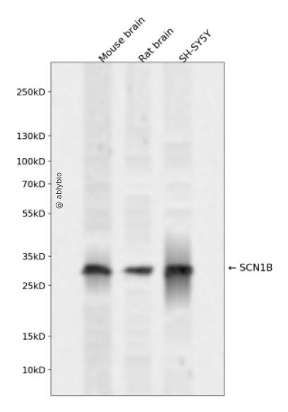 Western blot analysis of SCN1B expressed in Mouse brain,Rat brain,SH-SY5Y using SCN1B Rabbit pAb at 1:1000. Secondary antibody: HRP Goat Anti-Rabbit IgG (H+L) at 1:5000. Lysates/proteins: 30ug per lane. Blocking buffer: 5% non-fat dry milk in TBST. Detection: ECL Enhanced Kit. Exposure time: 120s.