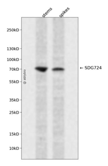 Western blot analysis of SDG724 expressed in stems,spikes using SDG724 Rabbit pAb at 1:1000. Secondary antibody: HRP Goat Anti-Rabbit IgG (H+L) at 1:5000. Lysates/proteins: 30ug per lane. Blocking buffer: 5% non-fat dry milk in TBST. Detection: ECL Enhanced Kit. Exposure time: 120s.