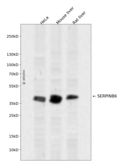 Western blot analysis of SERPINB6 expressed in HeLa,Mouse liver,Rat liver using SERPINB6 Rabbit pAb at 1:1000. Secondary antibody: HRP Goat Anti-Rabbit IgG (H+L) at 1:5000. Lysates/proteins: 30ug per lane. Blocking buffer: 5% non-fat dry milk in TBST. Detection: ECL Enhanced Kit. Exposure time: 120s.