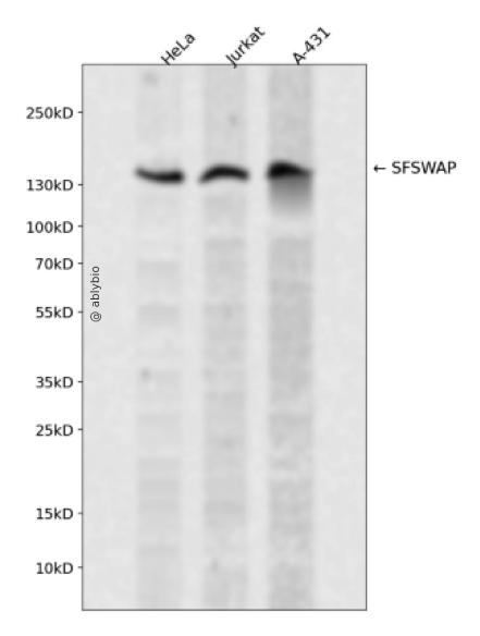Western blot analysis of SFSWAP expressed in HeLa,Jurkat,A-431 using SFSWAP Rabbit pAb at 1:1000. Secondary antibody: HRP Goat Anti-Rabbit IgG (H+L) at 1:5000. Lysates/proteins: 30ug per lane. Blocking buffer: 5% non-fat dry milk in TBST. Detection: ECL Enhanced Kit. Exposure time: 120s.