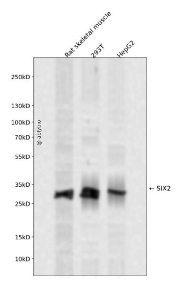 Western blot analysis of SIX2 expressed in Rat skeletal muscle,293T,HepG2 using SIX2 Rabbit pAb at 1:1000. Secondary antibody: HRP Goat Anti-Rabbit IgG (H+L) at 1:5000. Lysates/proteins: 30ug per lane. Blocking buffer: 5% non-fat dry milk in TBST. Detection: ECL Enhanced Kit. Exposure time: 120s.