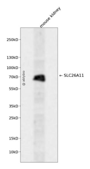 Western blot analysis of SLC26A11 expressed in mouse kidney using SLC26A11 Rabbit pAb at 1:1000. Secondary antibody: HRP Goat Anti-Rabbit IgG (H+L) at 1:5000. Lysates/proteins: 30ug per lane. Blocking buffer: 5% non-fat dry milk in TBST. Detection: ECL Enhanced Kit. Exposure time: 120s.