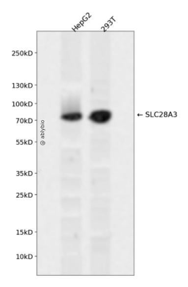 Western blot analysis of SLC28A3 expressed in HepG2,293T using SLC28A3 Rabbit pAb at 1:1000. Secondary antibody: HRP Goat Anti-Rabbit IgG (H+L) at 1:5000. Lysates/proteins: 30ug per lane. Blocking buffer: 5% non-fat dry milk in TBST. Detection: ECL Enhanced Kit. Exposure time: 120s.