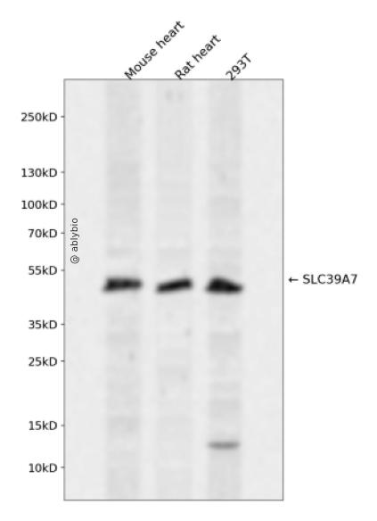 Western blot analysis of SLC39A7 expressed in Mouse heart,Rat heart,293T using SLC39A7 Rabbit pAb at 1:1000. Secondary antibody: HRP Goat Anti-Rabbit IgG (H+L) at 1:5000. Lysates/proteins: 30ug per lane. Blocking buffer: 5% non-fat dry milk in TBST. Detection: ECL Enhanced Kit. Exposure time: 120s.