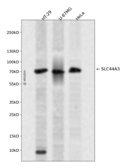 Western blot analysis of SLC44A3 expressed in HT-29,U-87MG,HeLa using SLC44A3 Rabbit pAb at 1:1000. Secondary antibody: HRP Goat Anti-Rabbit IgG (H+L) at 1:5000. Lysates/proteins: 30ug per lane. Blocking buffer: 5% non-fat dry milk in TBST. Detection: ECL Enhanced Kit. Exposure time: 120s.