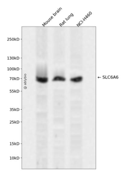 Western blot analysis of SLC6A6 expressed in Mouse brain,Rat lung,NCI-H460 using SLC6A6 Rabbit pAb at 1:1000. Secondary antibody: HRP Goat Anti-Rabbit IgG (H+L) at 1:5000. Lysates/proteins: 30ug per lane. Blocking buffer: 5% non-fat dry milk in TBST. Detection: ECL Enhanced Kit. Exposure time: 120s.