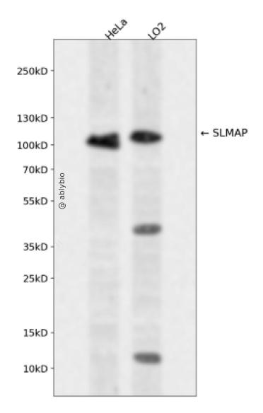 Western blot analysis of SLMAP expressed in HeLa,LO2 using SLMAP Rabbit pAb at 1:1000. Secondary antibody: HRP Goat Anti-Rabbit IgG (H+L) at 1:5000. Lysates/proteins: 30ug per lane. Blocking buffer: 5% non-fat dry milk in TBST. Detection: ECL Enhanced Kit. Exposure time: 120s.