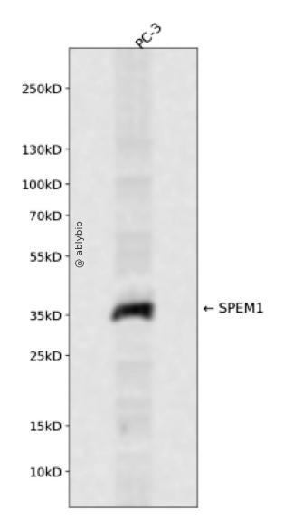 Western blot analysis of SPEM1 expressed in PC-3 using SPEM1 Rabbit pAb at 1:1000. Secondary antibody: HRP Goat Anti-Rabbit IgG (H+L) at 1:5000. Lysates/proteins: 30ug per lane. Blocking buffer: 5% non-fat dry milk in TBST. Detection: ECL Enhanced Kit. Exposure time: 120s.