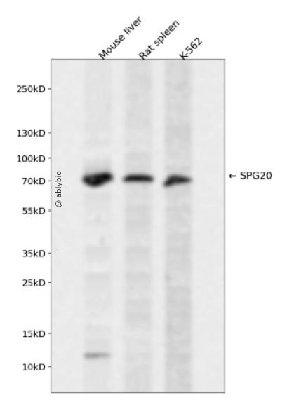 Western blot analysis of SPG20 expressed in Mouse liver,Rat spleen,K-562 using SPG20 Rabbit pAb at 1:1000. Secondary antibody: HRP Goat Anti-Rabbit IgG (H+L) at 1:5000. Lysates/proteins: 30ug per lane. Blocking buffer: 5% non-fat dry milk in TBST. Detection: ECL Enhanced Kit. Exposure time: 120s.