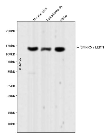 Western blot analysis of SPINK5 / LEKTI expressed in Mouse skin,Rat stomach,HeLa using SPINK5 / LEKTI Rabbit mAb at 1:1000. Secondary antibody: HRP Goat Anti-Rabbit IgG (H+L) at 1:5000. Lysates/proteins: 30ug per lane. Blocking buffer: 5% non-fat dry milk in TBST. Detection: ECL Enhanced Kit. Exposure time: 120s.