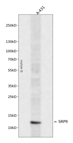 Western blot analysis of SRP9 expressed in A-431 using SRP9 Rabbit pAb at 1:1000. Secondary antibody: HRP Goat Anti-Rabbit IgG (H+L) at 1:5000. Lysates/proteins: 30ug per lane. Blocking buffer: 5% non-fat dry milk in TBST. Detection: ECL Enhanced Kit. Exposure time: 120s.