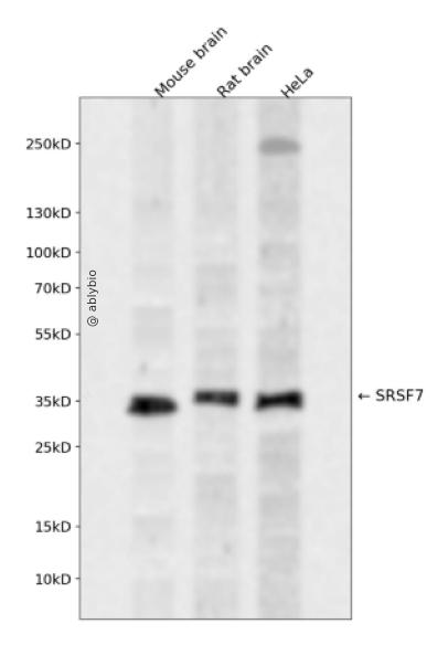 Western blot analysis of SRSF7 expressed in Mouse brain,Rat brain,HeLa using SRSF7 Rabbit pAb at 1:1000. Secondary antibody: HRP Goat Anti-Rabbit IgG (H+L) at 1:5000. Lysates/proteins: 30ug per lane. Blocking buffer: 5% non-fat dry milk in TBST. Detection: ECL Enhanced Kit. Exposure time: 120s.