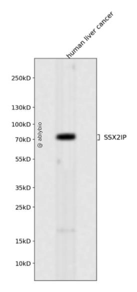 Western blot analysis of SSX2IP expressed in human liver cancer using SSX2IP Rabbit mAb at 1:1000. Secondary antibody: HRP Goat Anti-Rabbit IgG (H+L) at 1:5000. Lysates/proteins: 30ug per lane. Blocking buffer: 5% non-fat dry milk in TBST. Detection: ECL Enhanced Kit. Exposure time: 120s.