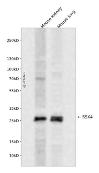 Western blot analysis of SSX4 expressed in Mouse kidney,Mouse lung using SSX4 Rabbit pAb at 1:1000. Secondary antibody: HRP Goat Anti-Rabbit IgG (H+L) at 1:5000. Lysates/proteins: 30ug per lane. Blocking buffer: 5% non-fat dry milk in TBST. Detection: ECL Enhanced Kit. Exposure time: 120s.