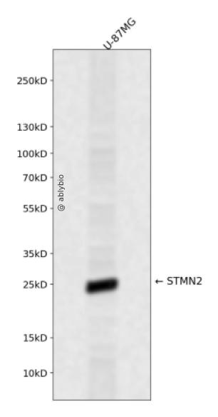 Western blot analysis of STMN2 expressed in U-87MG using STMN2 Rabbit pAb at 1:1000. Secondary antibody: HRP Goat Anti-Rabbit IgG (H+L) at 1:5000. Lysates/proteins: 30ug per lane. Blocking buffer: 5% non-fat dry milk in TBST. Detection: ECL Enhanced Kit. Exposure time: 120s.