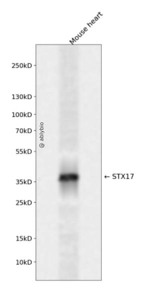 Western blot analysis of STX17 expressed in Mouse heart using STX17 Rabbit pAb at 1:1000. Secondary antibody: HRP Goat Anti-Rabbit IgG (H+L) at 1:5000. Lysates/proteins: 30ug per lane. Blocking buffer: 5% non-fat dry milk in TBST. Detection: ECL Enhanced Kit. Exposure time: 120s.
