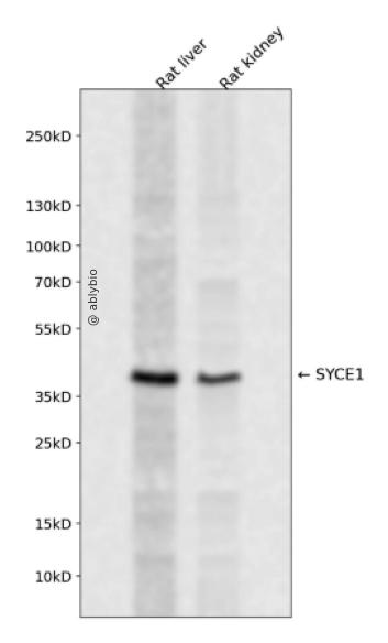Western blot analysis of SYCE1 expressed in Rat liver,Rat kidney using SYCE1 Rabbit pAb at 1:1000. Secondary antibody: HRP Goat Anti-Rabbit IgG (H+L) at 1:5000. Lysates/proteins: 30ug per lane. Blocking buffer: 5% non-fat dry milk in TBST. Detection: ECL Enhanced Kit. Exposure time: 120s.
