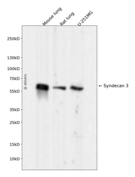 Western blot analysis of Syndecan 3 expressed in Mouse lung,Rat lung,U-251MG using Syndecan 3 Rabbit mAb at 1:1000. Secondary antibody: HRP Goat Anti-Rabbit IgG (H+L) at 1:5000. Lysates/proteins: 30ug per lane. Blocking buffer: 5% non-fat dry milk in TBST. Detection: ECL Enhanced Kit. Exposure time: 120s.